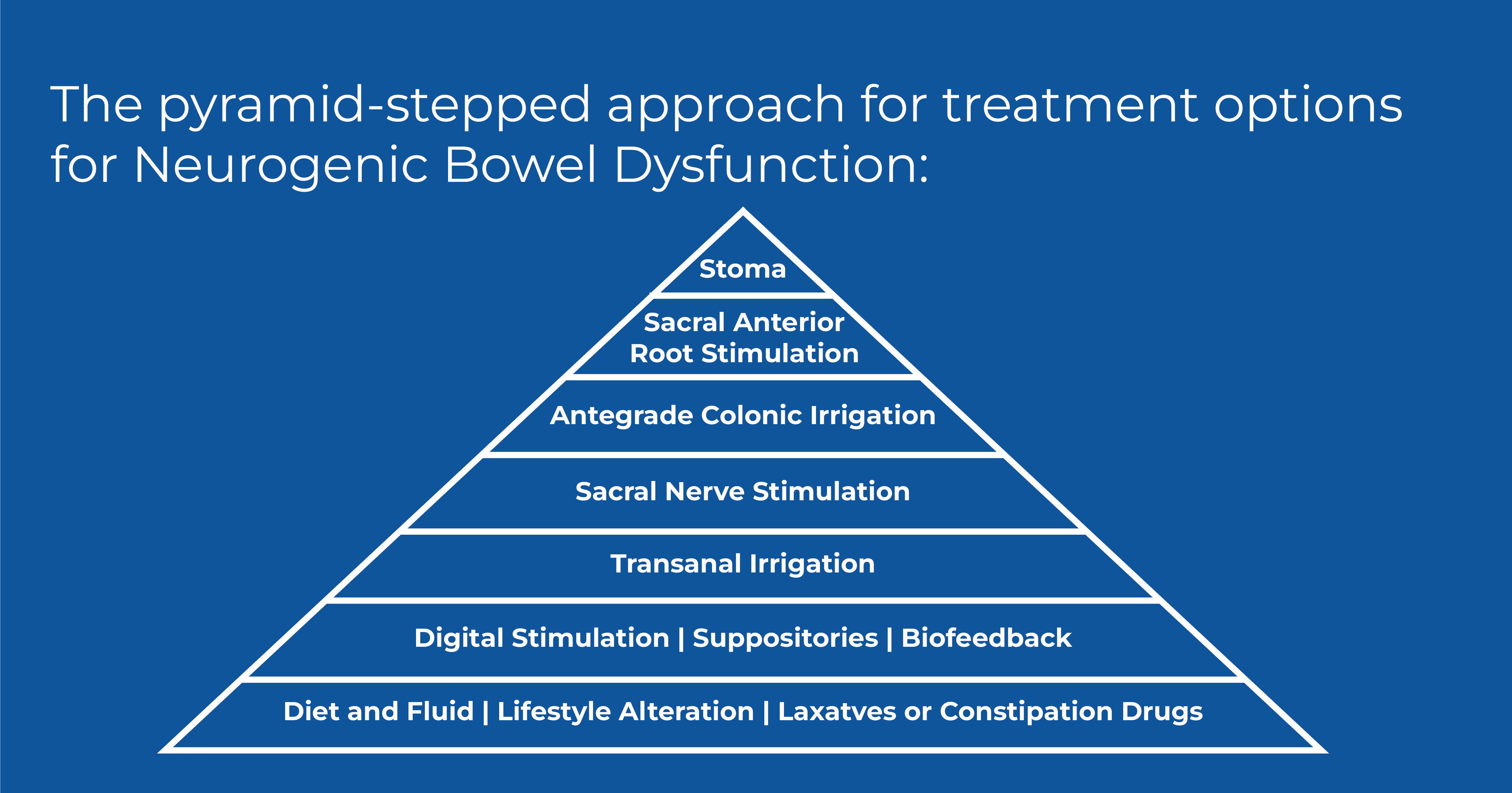 Neurogenic bowel dysfunction (NBD) is characterized by the impairment of normal bowel functions due to a neurological disorder. Symptoms include constipation and fecal incontinence, with the most common complications encompassing urinary tract infections (UTIs), hemorrhoids, abdominal pain, rectal bleeding and prolapse, annal fissure, and autonomic dysreflexia4. These symptoms are commonly associated with recurrent hospital admissions and cause costs related to visits, diagnostic assessments, surgical procedures, and adverse events, such as gastrointestinal infections and intestinal obstructions. Careful evaluation of the patient´s medical history and an accurate clinical examination to determine the most appropriate treatment for each patient is most important. A pyramid-stepped approach for NBD treatment has been extensively used in clinical practice to adapt both the symptoms and the patient´s approach to optimize the patient´s bowel management regimen5. Treatment begins with a conservative approach focusing on optimizing the bowel regime such as SBC and progresses to more invasive measures such as surgical colonic irrigation or the creation of a stoma. There are treatment options in between such as TAI and neuromodulation techniques when SBC treatment is unsuccessful6. Based on this treatment regimen, Ruggeri et al investigated the cost-effectiveness of TAI therapy, specifically using the Navina Smart device, for patients who have failed SBC versus continuing with SBC alone within the Italian context.