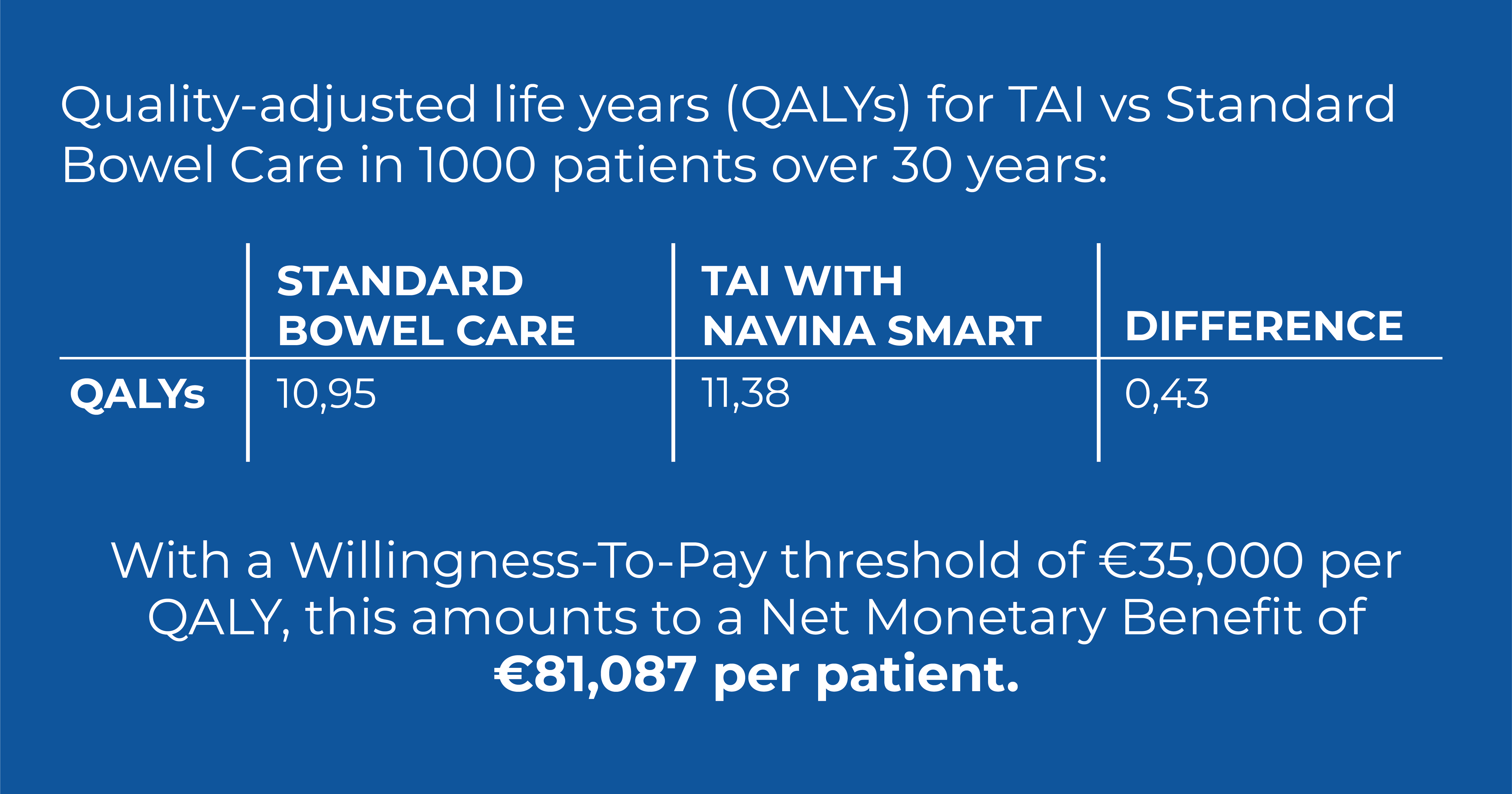 With a willingness to pay at € 35,000.00/QALYs and comparing incremental costs and incremental QALYs, TAI treatment with Navina Smart has the potential to yield savings of € 66,101 and 0,43 QALYs per patient over 30 years and correlated with reduction in the probability of surgical interventions, stoma creation, adverse events, and HCP visits. The NMB, when quantifying the difference between monetary benefits and associated intervention costs, was estimated to be € 81,087 per patient over 30 years.
