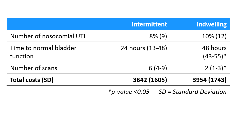 결과는 간헐적 도뇨법 그룹에서 보고된 발생 건수가 더 적었지만, 두 그룹 간의 요로감염 발생률에 통계적으로 유의한 차이는 나타나지 않았습니다. 간헐적 도뇨법을 사용한 경우 정상적인 배뇨로 더 빨리 복귀하는 경향이 있었습니다.
