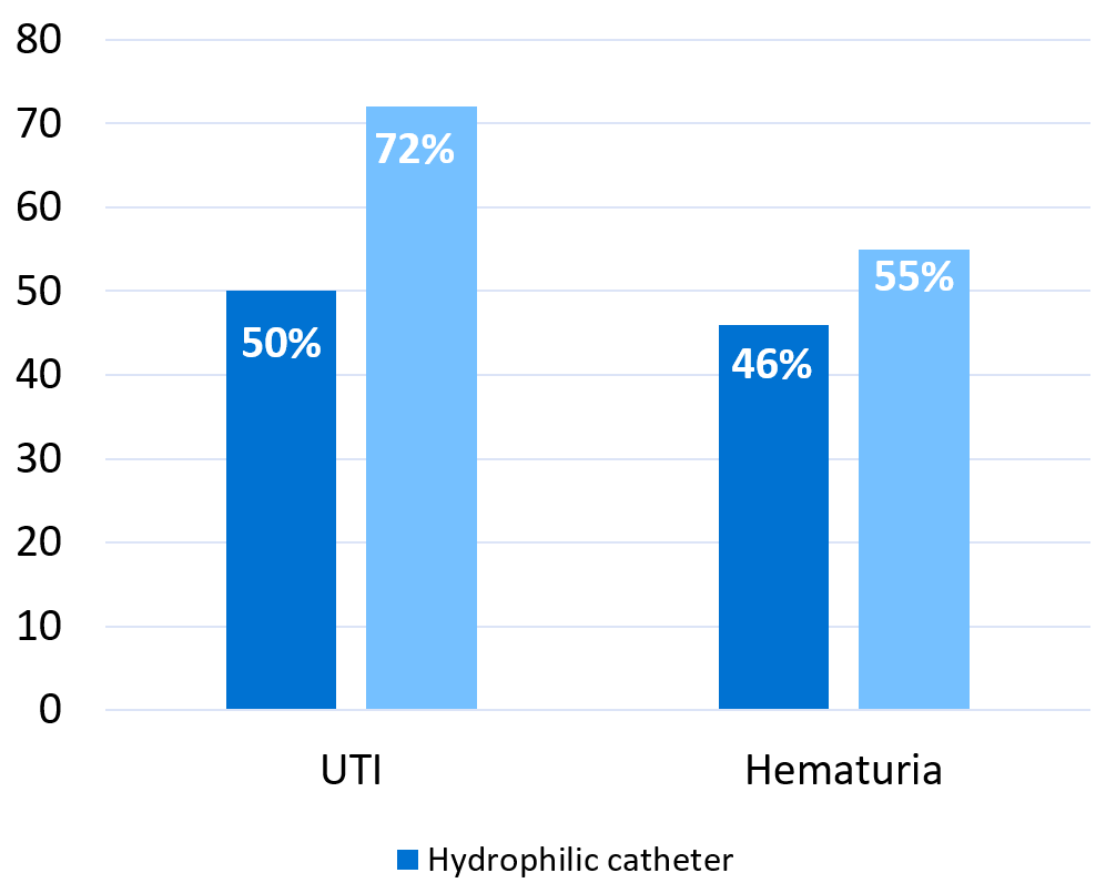위의 수치들은 비친수성 카테터에 비해 친수성 카테터를 사용할 경우 요로감염에 대한 예상 위험을 64%, 혈뇨 위험을 43% 감소시키는 것으로 해석될 수 있습니다.