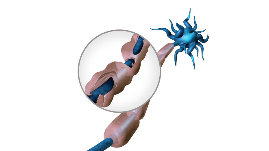 In MS, the body's immune system mistakenly attacks the myelin tissue, whose function is to protect the nerve fibers in the central nervous system and to ensure smooth transition of messages between the brain and the body. These attacks damage the protective myelin tissue (called demyelination) and nerve cells which interferes with messages getting through properly.