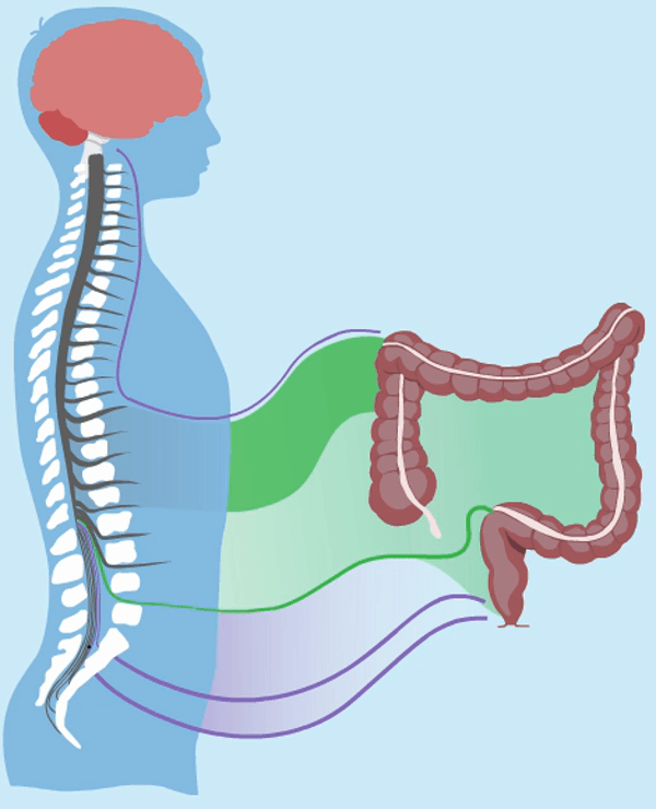 The parasympathetic nervous system stimulates motility and is connected to the bowel and the bladder through nerves at the sacral region of the spinal cord. The sympathetic nervous system inhibits motility and is connected to the bowel through the mesenteric nerves and the hypogastric nerves at the sacral region. These nerves also control the bladder. That is why many persons with NBD not only have problem with defecation, but also a dysfunctional bladder. The ascending colon and around two thirds of the transverse colon are innervated by the parasympathetic nerves from between the S1 and L5 vertebrae. The left part of the colon and rectum are innervated by the pelvic nerves. The anal region is innervated by the pudendal nerves.