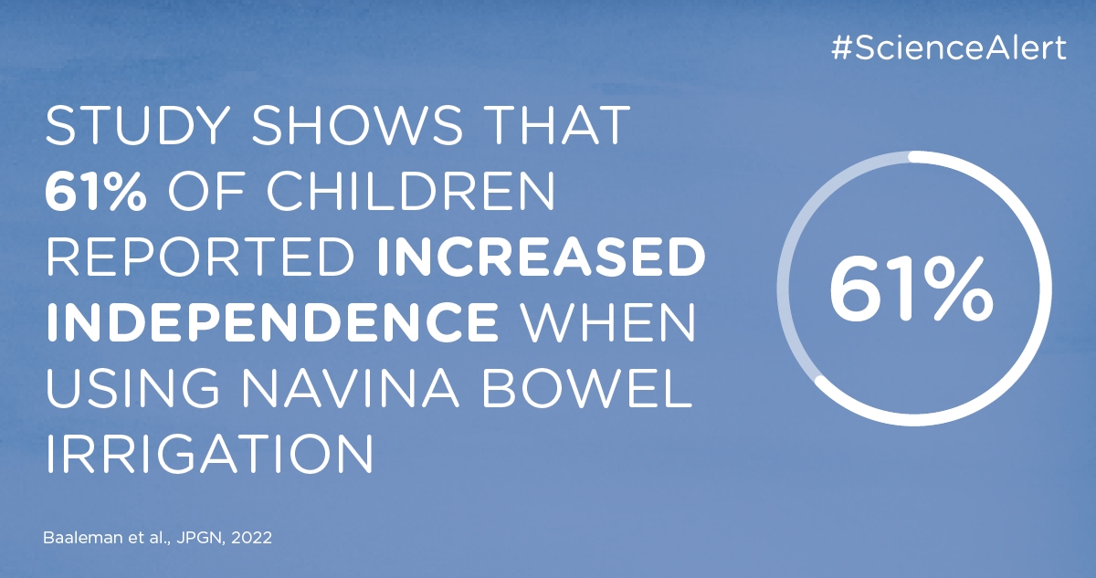 New science news reported in this study is that factors such as patient independence, patient experience, and patient empowerment were also investigated. The majority of children (61%) reported that since use of Navina Irrigation System their independence increased, and the use was considered easy or very easy by 94% of the children. Patient empowerment was measured with the Gothenburg Young Persons Empowerment Scale (GYPES) that showed similar levels as reported in children with other chronic conditions. However, more than half of the children found the use of TAI bothersome and the most bothersome was the time it takes.
