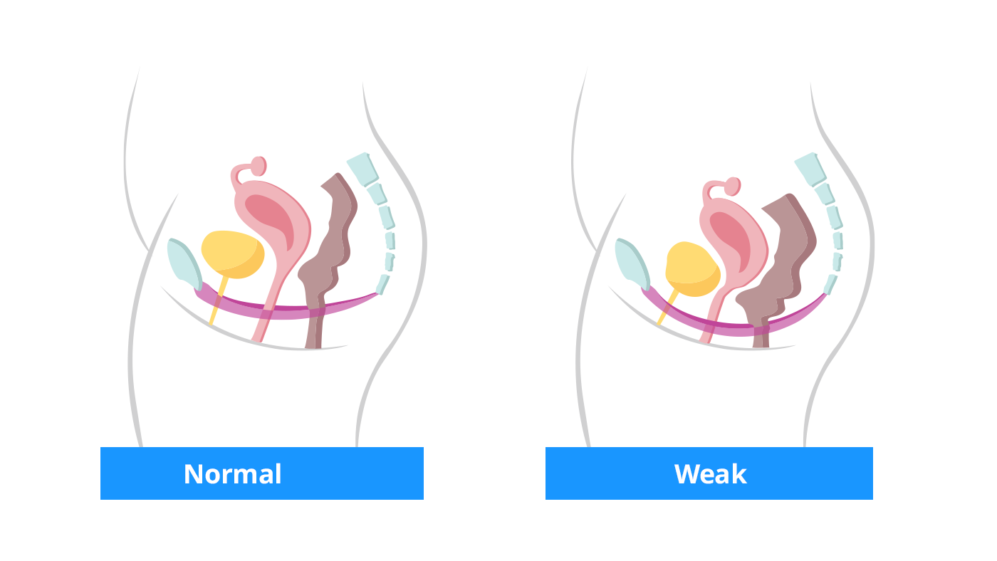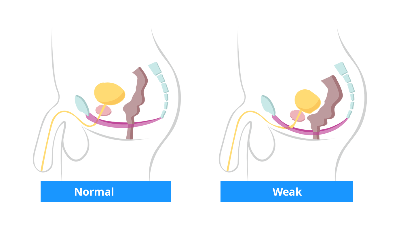 Male anatomy: In the first image is a healthy pelvic floor that supports the bladder and bowel, and in the second image, is a weakened pelvic floor causing the organs to move or slipp out of its normal position.