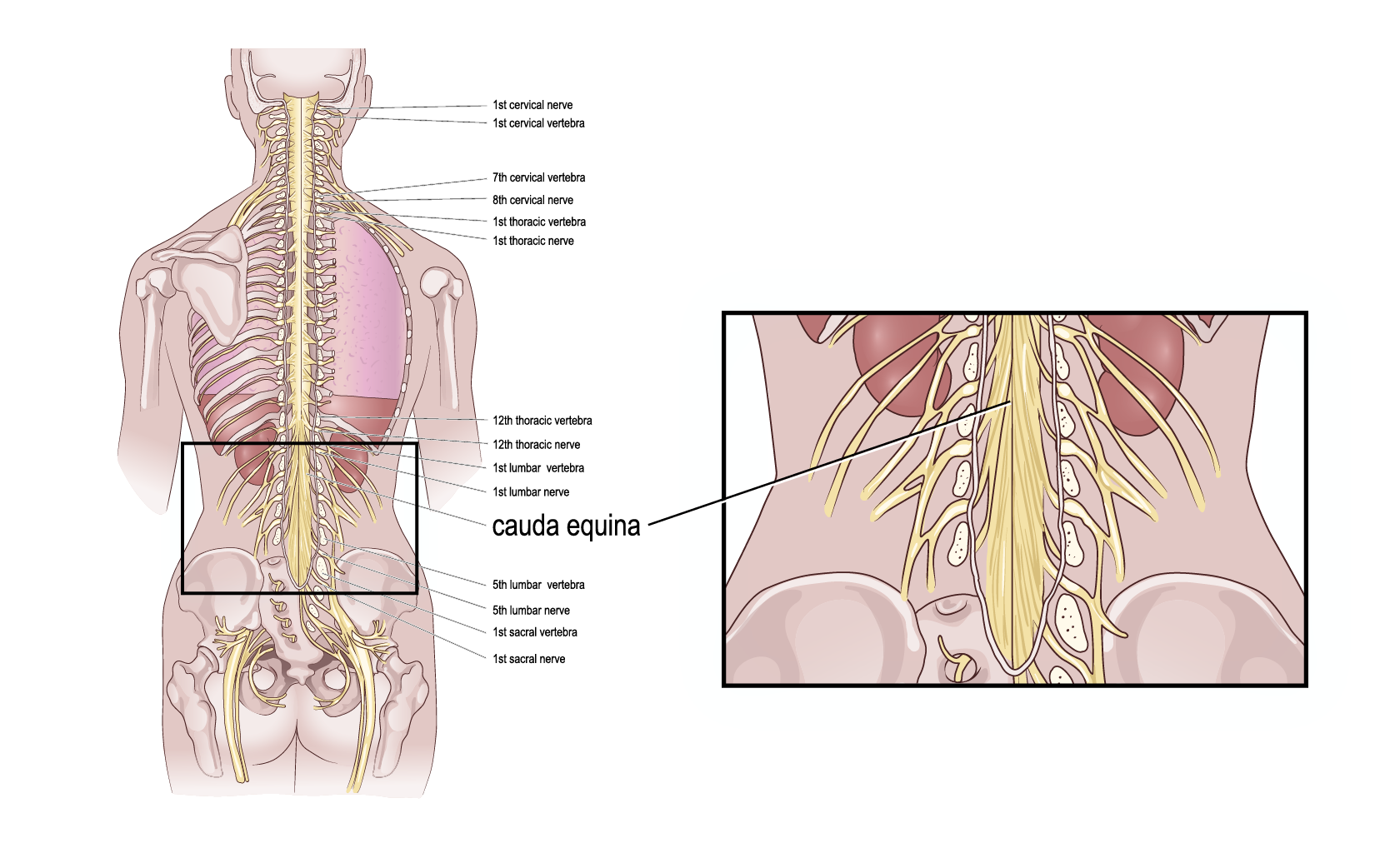Cauda equina syndrome (CES) is a condition that affects the bundle of nerves located at the lower end of the spinal cord, called the cauda equina (latin for horse’s tail). This bundle of nerves is part of what controls the bladder, bowel, and sexual function as well as the lower limbs. When these nerves become compressed or damaged, it can lead to various symptoms like: